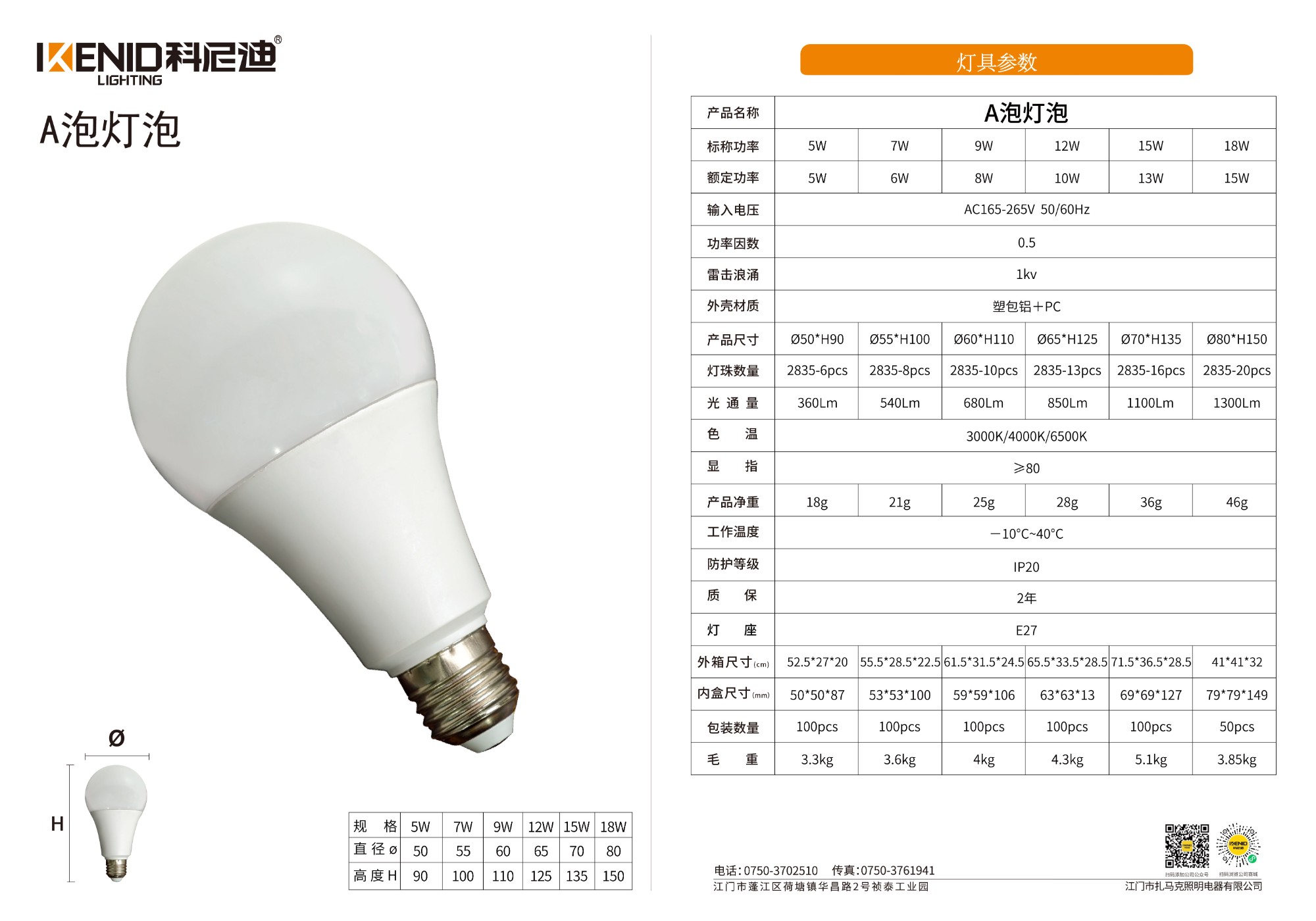 名称:A泡系列 功率:5W/7W/9W/12W/15W/18W 色温:3000K/4000K/6500K
